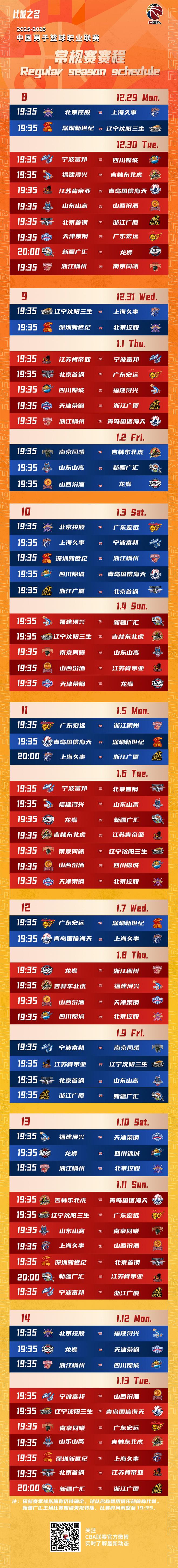 CBA常规赛赛程出炉,新赛季12月12日打响